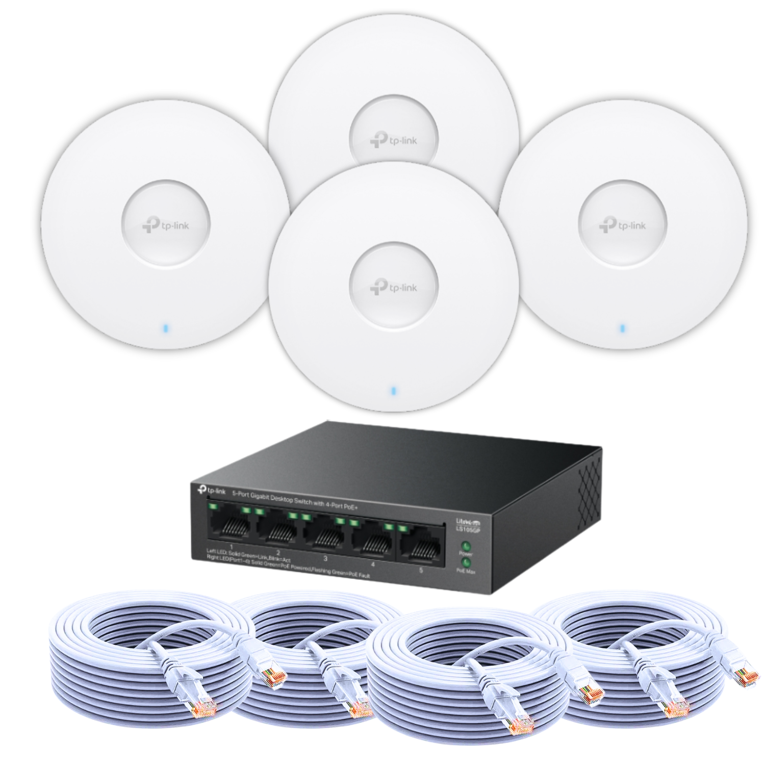 ✅ 1 x TP-Link LS105GP – 4-Port Gigabit PoE Smart Switch (60W) to power your access points and other PoE-enabled devices via Ethernet cables, simplifying installation.